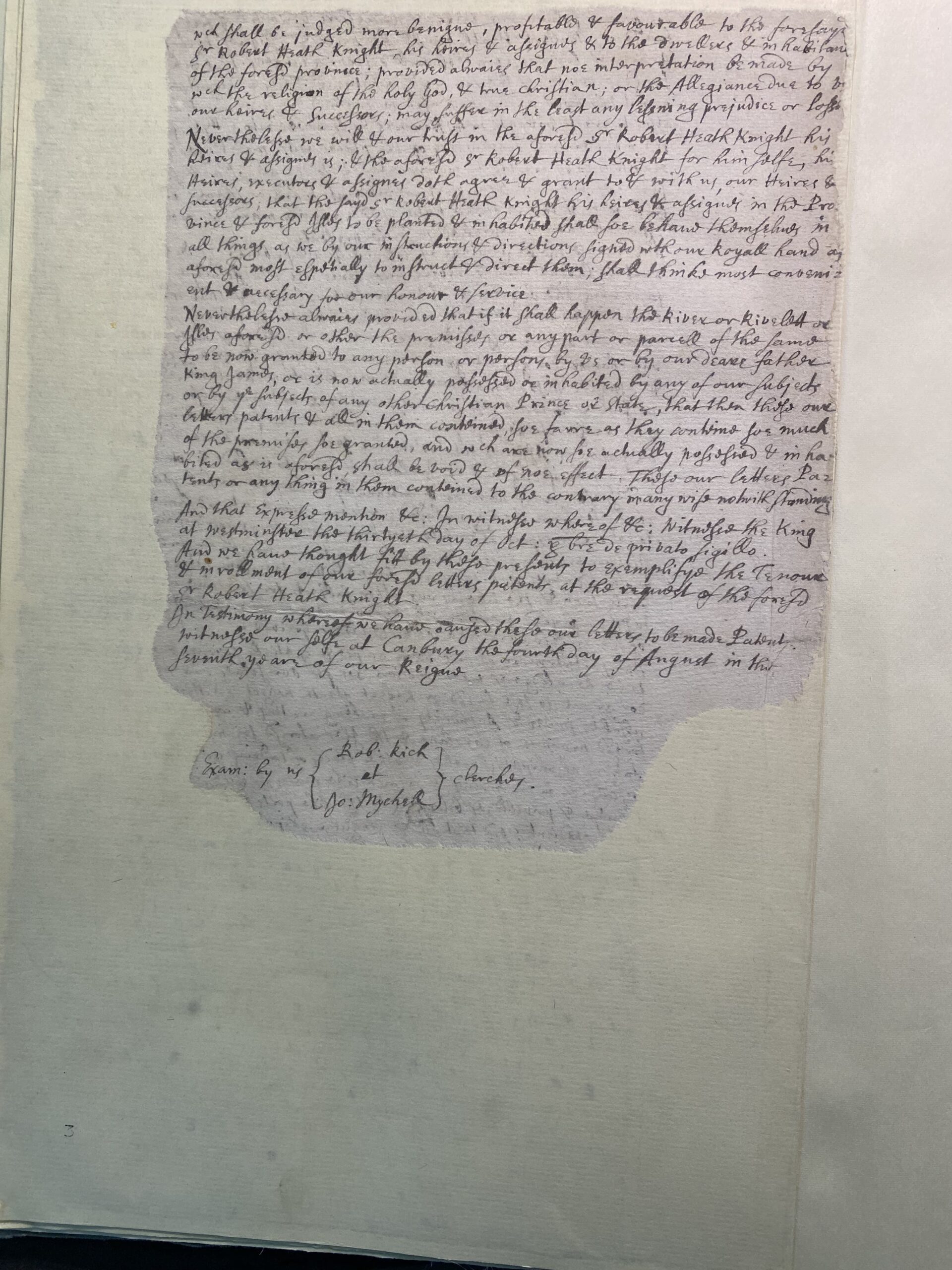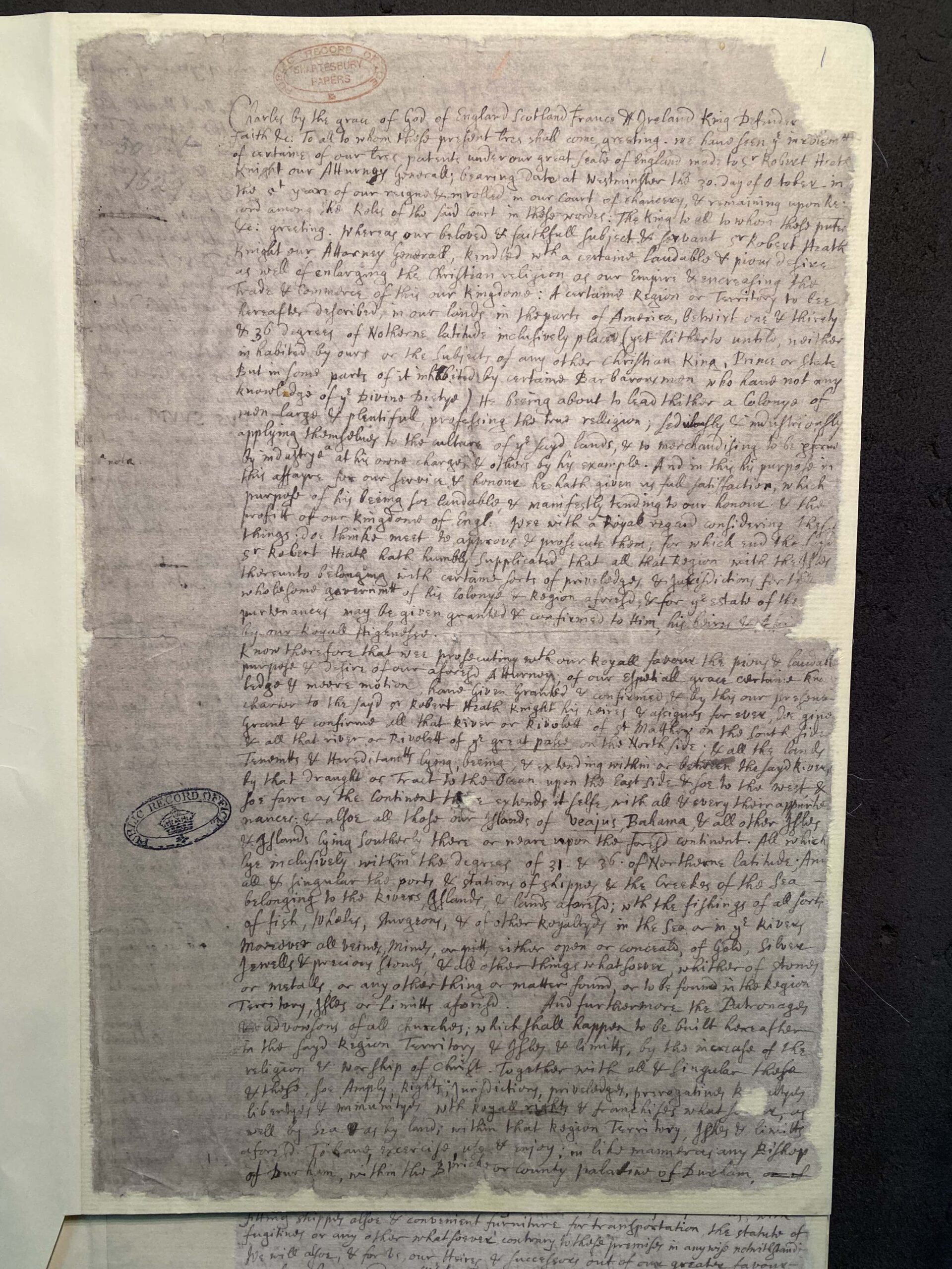 Charles by the grace of God of England Scotland France & Ireland King Defender of the faith &c: To all to whom these present l[ette]res shall come, greeting. We have seen the inrolement of certaine of our l[ette]res patents under our great scale of England made to Sr Robert Heath Knight our Atturney Generall, bearing date at Westminster the 30. day of October in the 5 yeare of our reigne & inrolled in our Court of Chancery, & remaining upon Record among the Roles of the Said Court in these words: The king to all to whom these present &c: greeting. Whereas our beloved and faithful subject and servant Sr Robert Heath Knight our Atturney Generall, kindled with a certain laudable and pious desire as well of enlarging the Christian religion as our Empoire & encreasing the Trade & Commerce of this our kingdom: A certaine Region or Territory to bee hereafter described, in our lands in the parts of America betwixt one & thirety & 36 degrees of northerne latitude inclusively placed (yet hitherto untild1Untitled., neither inhabited by ours or the subjects of any other Christian king, Prince or state But some parts of it inhabited by certain Barbarous men who have not any knowledge of the Divine Dietye2Deity, or God) He being about to lead thither a Colonye of men large & plentifull, professing the true religion; seduously3Sedulously, or Diligently, attentively. & industriously applying themselves to the culture of the sayd lands & to merchandising to be performed by industry & at his owne charges & others by his example. And in this his purpose in this allayer4A mitigator or an assauger. for our service and honour he hath given us full satisfaction, which purpose of his being soe laudable & manifestly tending to our honour, & the profit of our kingdome of England Wee with a Royal regard considering these things doe thinke meete to approve & prosecute them, for which end the sayd Sr Robert Heath hath humbly supplicated that all that Region with the Isles thereunto belonging with certain sorts of privileges & jurisdictions for the wholesome government of his Colonye & Region aforesaid & for the estate of the appurtenances5A minor property, right, or privilege, belonging to another more important, and passing in possession with it (Oxford English Dictionary, OED henceforth). may be given granted and confirmed to him, his heires & Assignes by our Royall Highnesse.