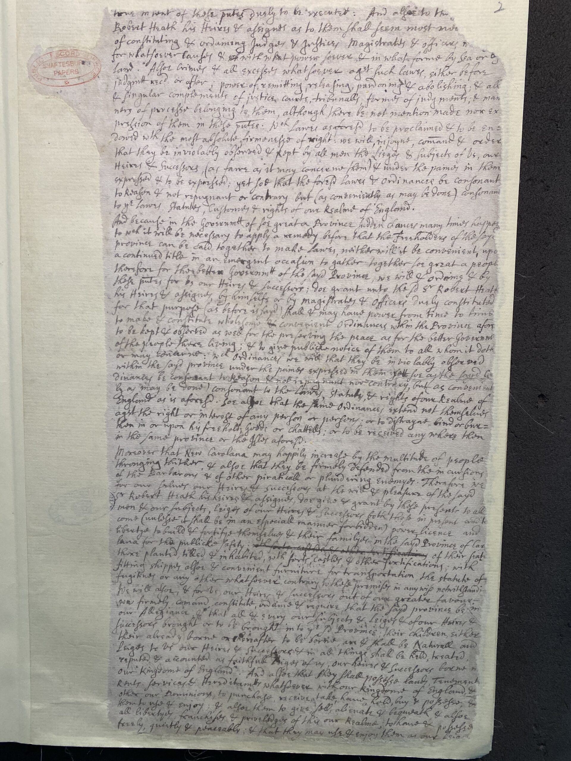 Moreover that New Carolana may happily increase by the multitude of people thronging15To assemble or move in a group or crowd (OED). thither & alsoe that they be firmely defended from the incursions of the Barbarous & of others practicall or plundering enemyes. Therefore we for ourselves our Heires & Successors at the will & pleasure of the sayd Sr Robert Heath his heires and assignee, doe give & grant by these presents to all men & our subjects, ledges of our heires and successors both those in present & to come (unless it shall be in an especiall manner forbidden) power, licence & libertye to build & fortifye themselves & their familyes in the sayd Province of Carolana for the publicke safety of their seats there planted, tilled & inhabited with forts castles & other fortifications, with fitting stripes alsoe & convenient; furniture for transportation the statute of fugitives or any other whatsoever contrary to these premises in any wise notwithstanding. We will alsoe & for us our Heires & successors out of our great favour we firmely comand constitute ordaine & require that the said Province be in our Allegiance & that all & every our subjects: & ledges & of our heires & successors brought or to be brought into the said Province, their children either their already borne or hereafter to be borne are & shall be Naturall and leiges to us our Heires & successors & in all things shall be held, treated reputed & accounted as faithful ledges of us, our heires & successors borne in our Kingdom of England. And alsoe that they shall possesse lands, tenements, rents services & Hereditaments whatsoever with our Kingdome of England & other our Dominions to purchase, receive, take, have, hold, buy and possesse & them to use & enjoy & alsoe then to give sell alienate & bequeath & alsoe all libertyes, franchises & priviledges of this our Realme, to have & possess freely, quietly & peaceably; & that they may use enjoy them as our ledges
