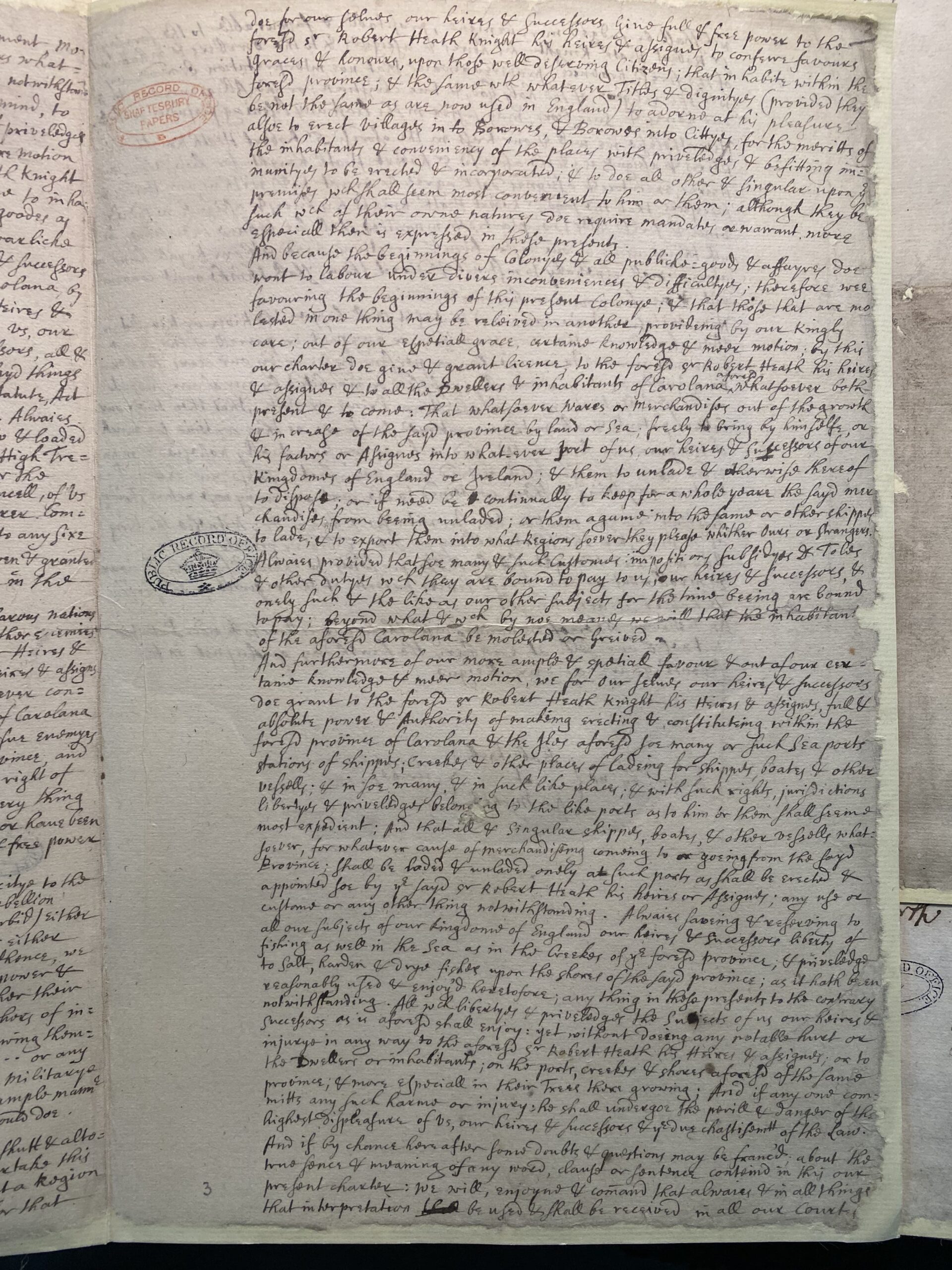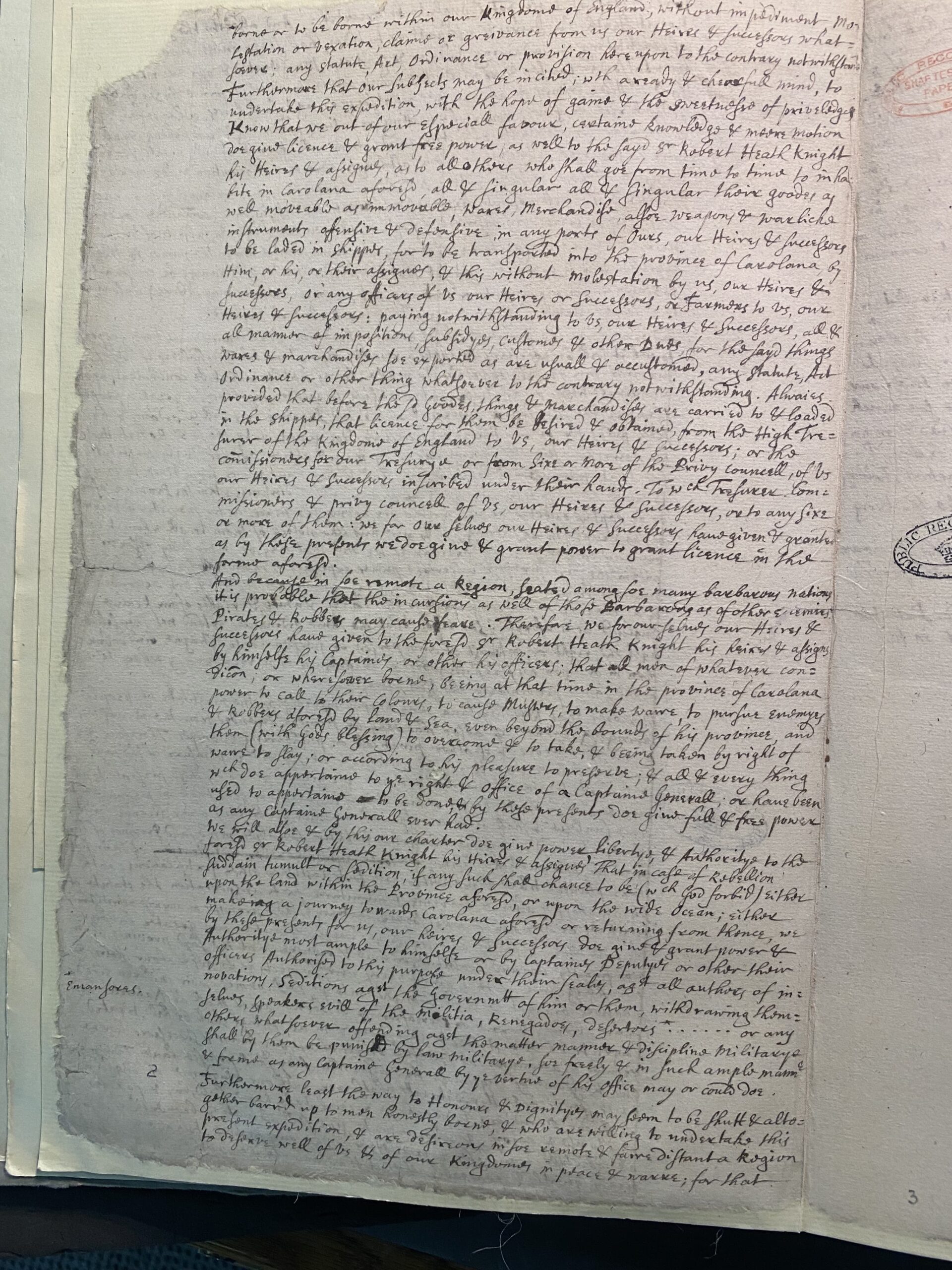 borne or to be borne within our Kingdom of England without impediment molestation or vexation, claime or grievance from us our Heires & successors whatsoever; any statute, act Ordinance or provision here upon to the contrary notwithstanding: furthermore that our subjects may be incited with a ready & cheerful mind, to undertake this expedition with the hope of gaine & the meeknesse of priviledges. Know that we out of our especiall favour, certain knowledge & meere motion doe give license & grant free power, as well to the said Sr Robert Heath Knight his Heires & assignee as to all others who shall goe from time to time to inhabits in Carolana aforesaid, all & singular their goods as well moveable as immoveable wares, merchandise alsoe weapons & warlicke instruments offensive & defensive in any ports of ours, our Heires & successors to be laded in shipper, for to be transported into the province of Corolana, by him or his, or their assignee & this without molestation by us our Heires & successors or any officers of us our Heires or successors, or farmers to us, our Heires & successors: paying notwithstanding to us, our Heires & successors all & all manner of impositions, subsidyes, customes & other Dues for the sayd things wares & merchandises soe exported as are usuall & accustomed, any statute act Ordinance or other thing whatsoever to the contrary notwithstanding. Alwaies provided that before the sayd Goodes, things & merchandises are carried to & loaded in the shippes that licence for them be desired & obtained from the High Treasurer of the Kingdome of England to us, our heires & successors, or the commissioners for our Treasurye or from six or more of the Privy Councell, of us our Heires & successors inscribed under their hands To which Treasurer Commissioners & privy Councell of us our heirs & successors or to any sine or more of them; we for ourselves our Heires & successors have given & granted as by these presents we doe give & grant power to grant licence in the form aforesayd. And because in soe remote a Region, seated among so many barbarous nations it is probable that the incursions as well of those Barbarous as of other enemyes Pirates & Robbers may cause feare. Therefore we for ourselves our Heires & successors have given to the foresayd Sr Robert Heath Knight his heires & assignee by himself his Captains or other his officers, that all men of whatever condition, or wherever borne, being at that time in the Province of Carolana power to call to their colours, to cause Musters to make warre, to pursue enemyes & Robbers aforesaid by land & sea, even beyond the bounds of his province, and then (with Gods blessing) to overcome & to take, & being taken by right of warre to slay, or according to his pleasure to preserve, & all & every thing which doe appertains to the right & office of a Captaine Generall or have been used to appertaine to be done & by these presents doe give full & free power as any Captaine Generall ever had.