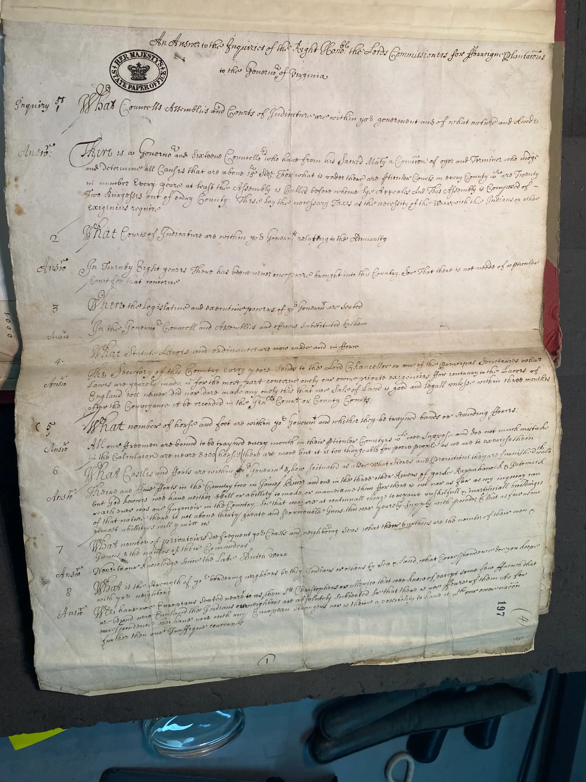 Back in England, those appointed to supervise the colonies often wrote to governors to learn about the various colonies’ structure, affairs, etc. In 1670, these supervisors wrote to Virginia’s governor to inquire about the colonies government.