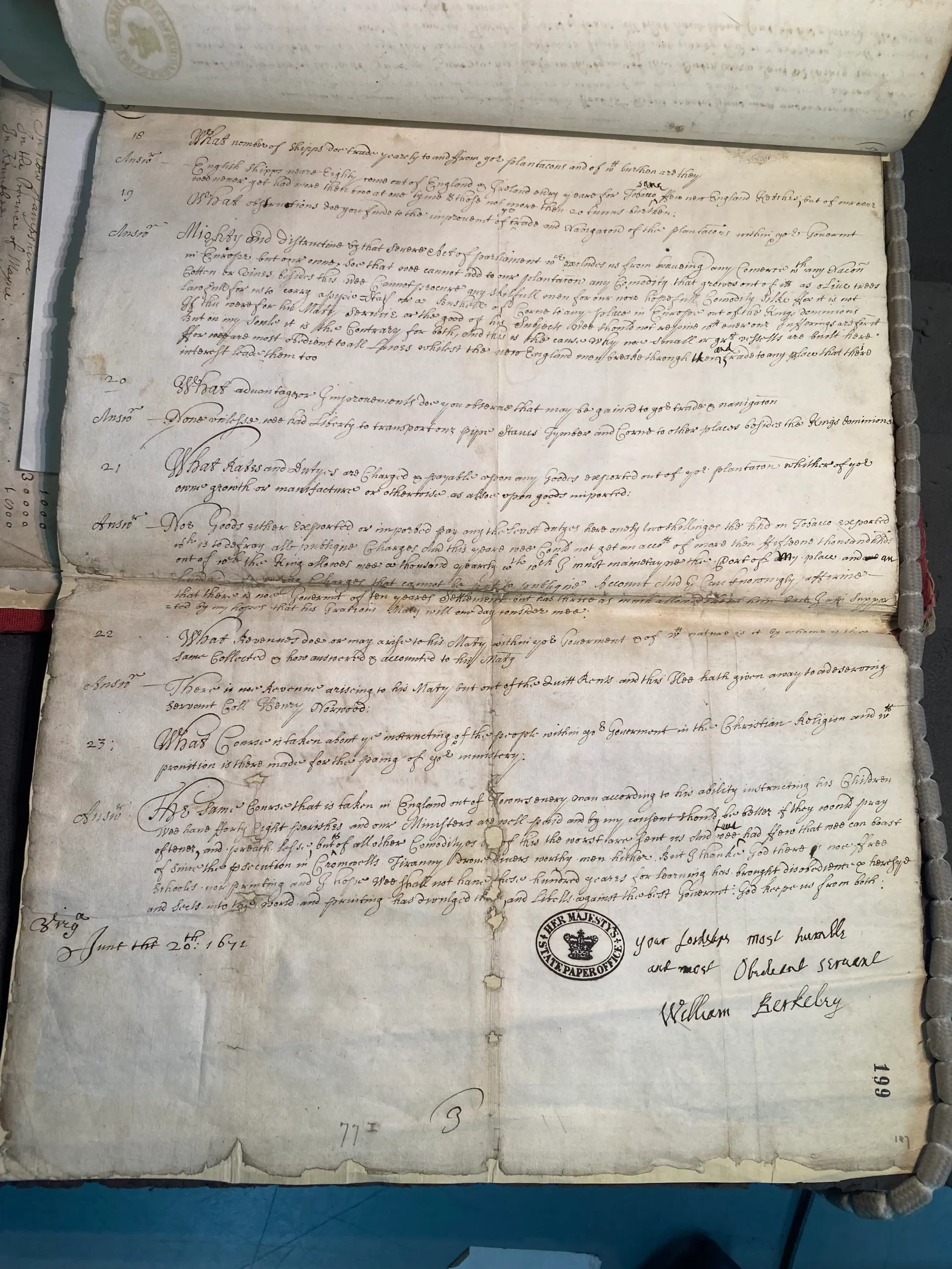 The King appointed a “Council on Foreign Plantations” that supervised all of the colonies. In 1670 these Councillors—great lords—in England wrote to Governor William Berkeley of Virginia, who was governor for more than 37 years in total. He wrote back to them in 1671 with his answers.