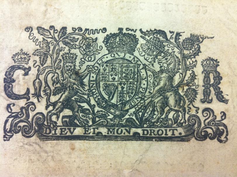 Above is an “imprimatur” from a 1662 edition of Virginia laws with the King’s Arms (below) that accompanied it.