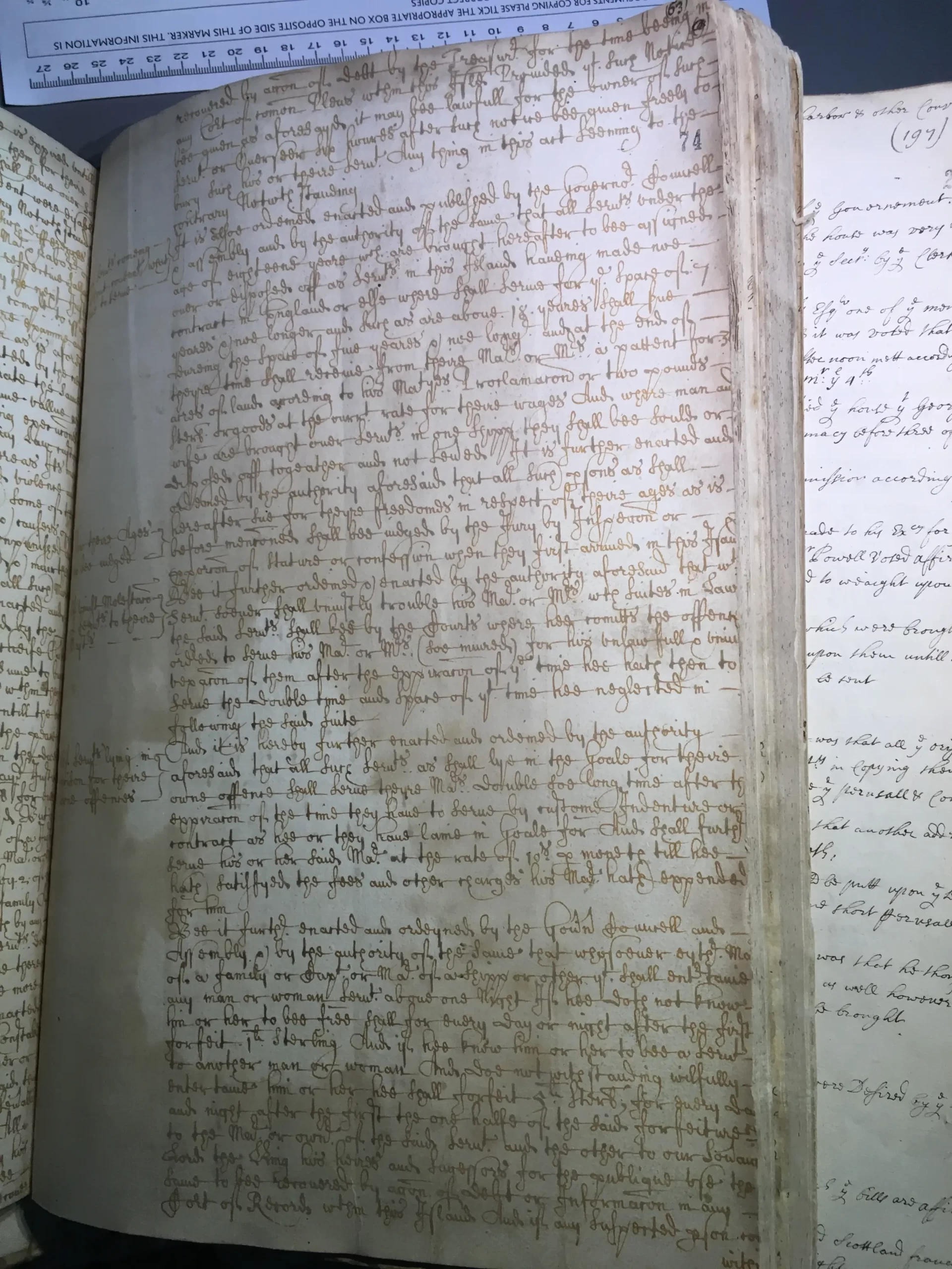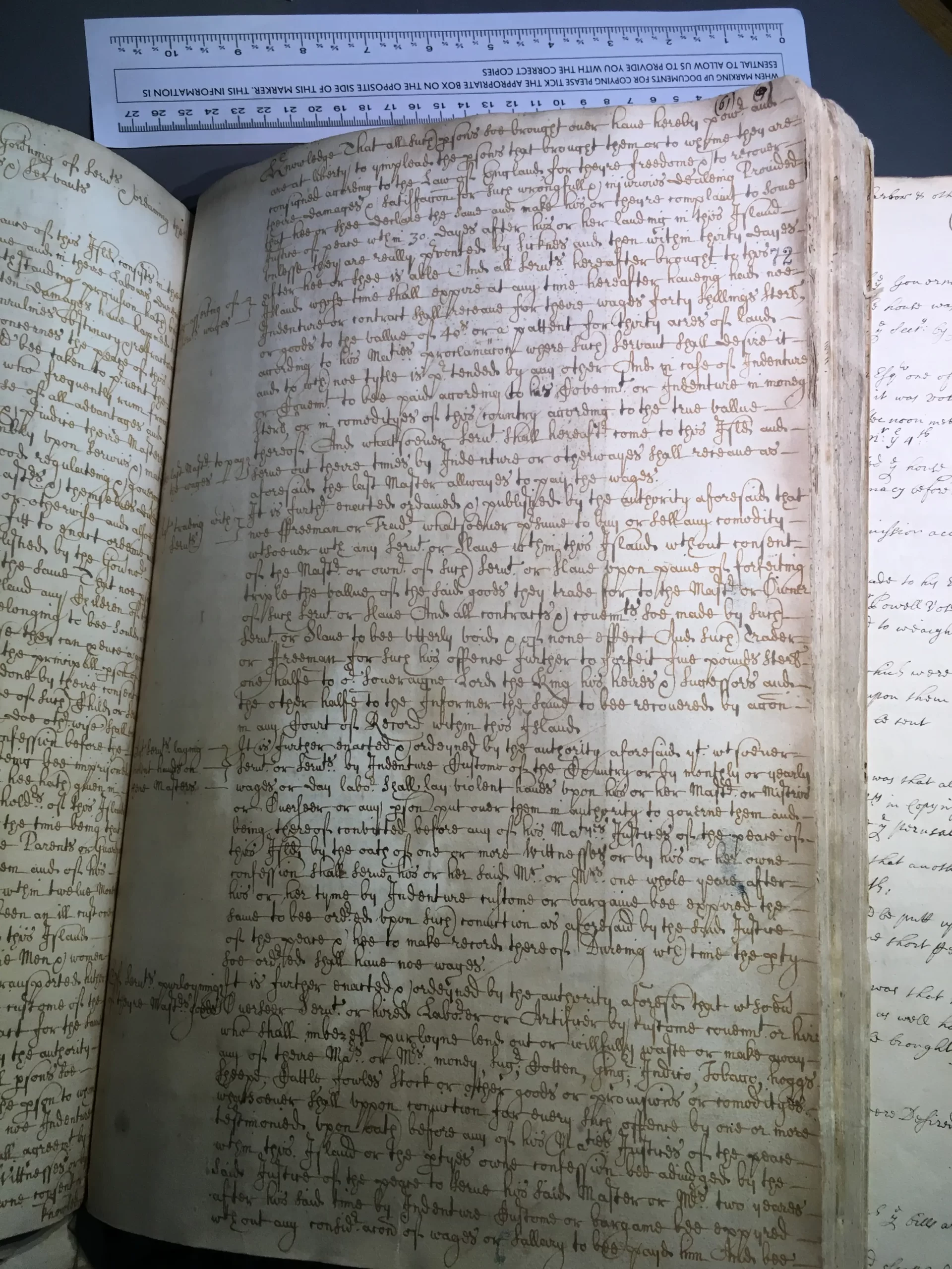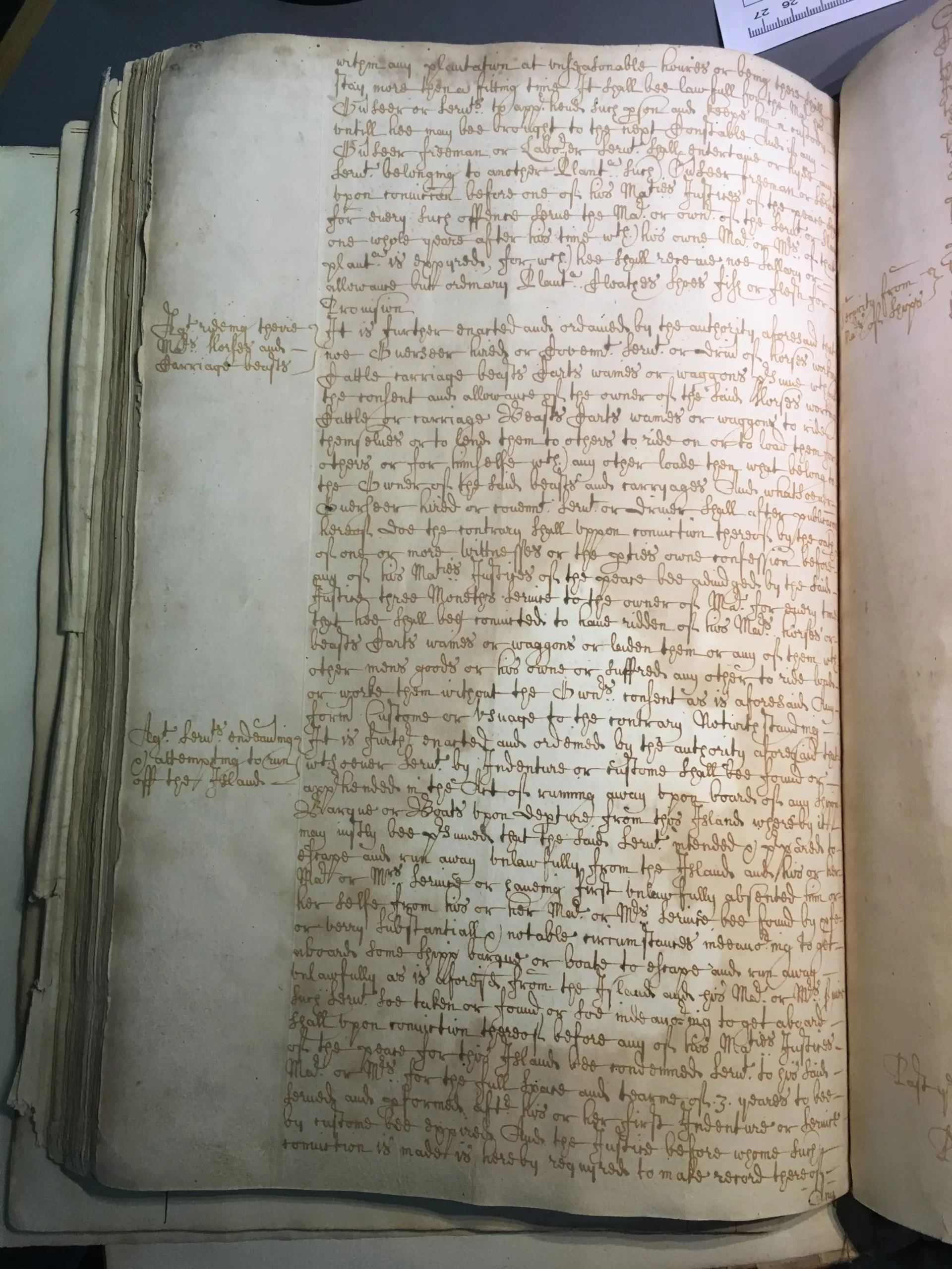 It is further enacted and ordained by the authority aforesaid that noe Overseer hired or Covenant Servant or driver of horses working Cattle carriage beasts Carts waines(?) or waggons [UNCLEAR] without the consent and allowance of the owner of the said horses working Cattle or carriage Beasts Carts waines(?) or waggons to ride themselves or to lend them to others to ride on or worke them for others or for himself with any other loade then what belong to [OBSCURE] the Owner of the said beasts and carryages And whatsoever Overseer hired or covenant Servant or driver shall after publication hereof doe the contrary shall uppon conviction thereof by the oath of one or more wittnesses or the parties owne confession before any of his Majesties Justices of the peace bee adjudged by the said Justice three Moneths [Months] Service to the owner of [UNCLEAR] for every time that hee shall bee convicted to have ridden of his Masters horses or beasts Carts waines or waggons or leiden(?) team or any of them with other mens goods or his owne or suffered any other to ride leid(?) or worke them without the Owners consent as is aforesaid Any from Custome or Asuage(?) to the contrary Notwithstanding.