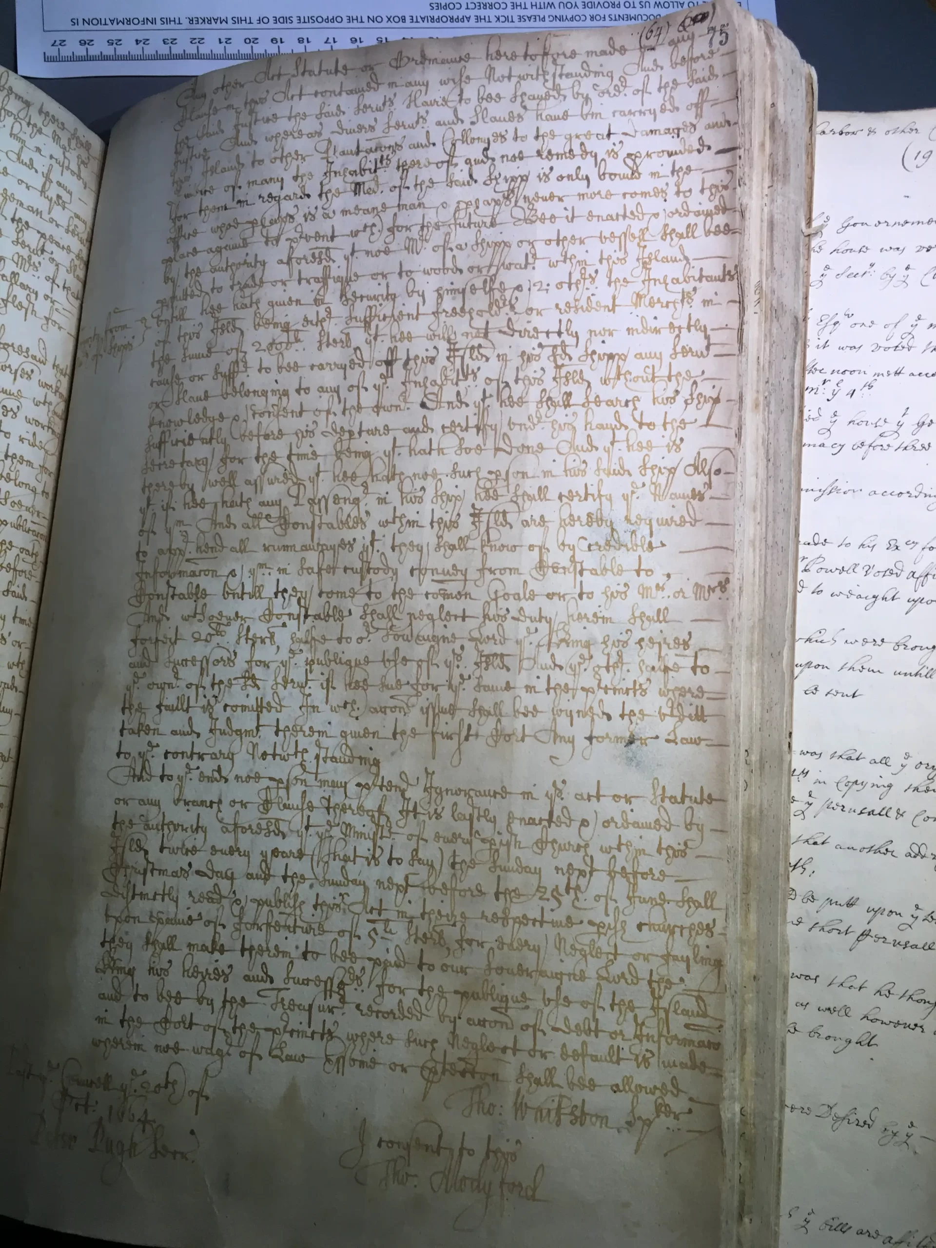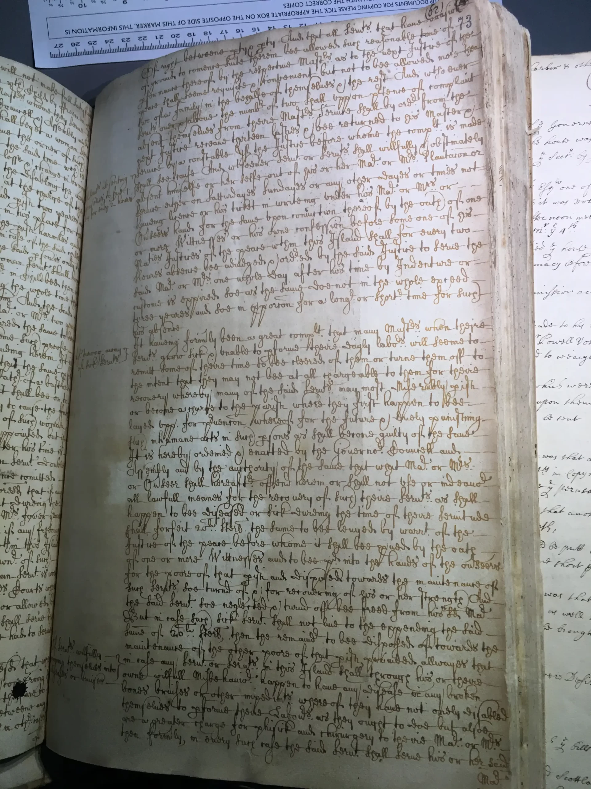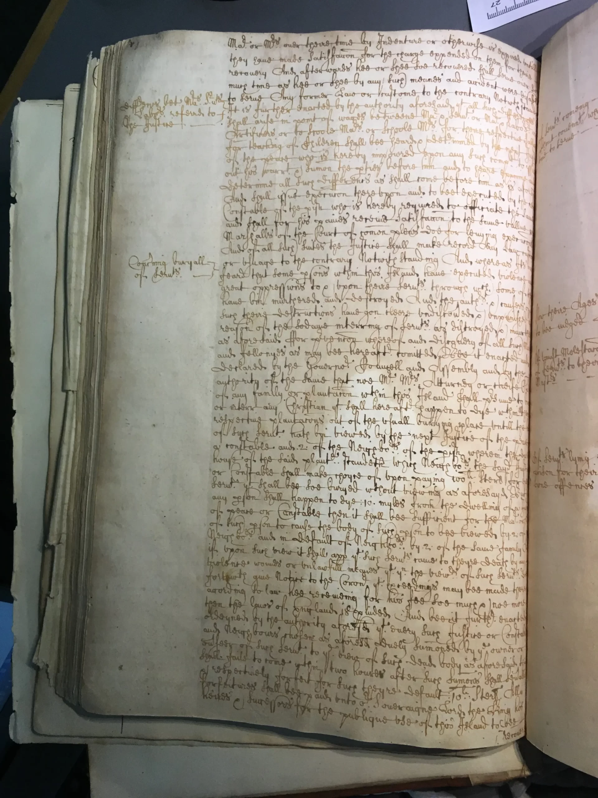 It is further enacted and ordained by the authority aforesaid that noe Overseer hired or Covenant Servant or driver of horses working Cattle carriage beasts Carts waines(?) or waggons [UNCLEAR] without the consent and allowance of the owner of the said horses working Cattle or carriage Beasts Carts waines(?) or waggons to ride themselves or to lend them to others to ride on or worke them for others or for himself with any other loade then what belong to [OBSCURE] the Owner of the said beasts and carryages And whatsoever Overseer hired or covenant Servant or driver shall after publication hereof doe the contrary shall uppon conviction thereof by the oath of one or more wittnesses or the parties owne confession before any of his Majesties Justices of the peace bee adjudged by the said Justice three Moneths [Months] Service to the owner of [UNCLEAR] for every time that hee shall bee convicted to have ridden of his Masters horses or beasts Carts waines or waggons or leiden(?) team or any of them with other mens goods or his owne or suffered any other to ride leid(?) or worke them without the Owners consent as is aforesaid Any from Custome or Asuage(?) to the contrary Notwithstanding.