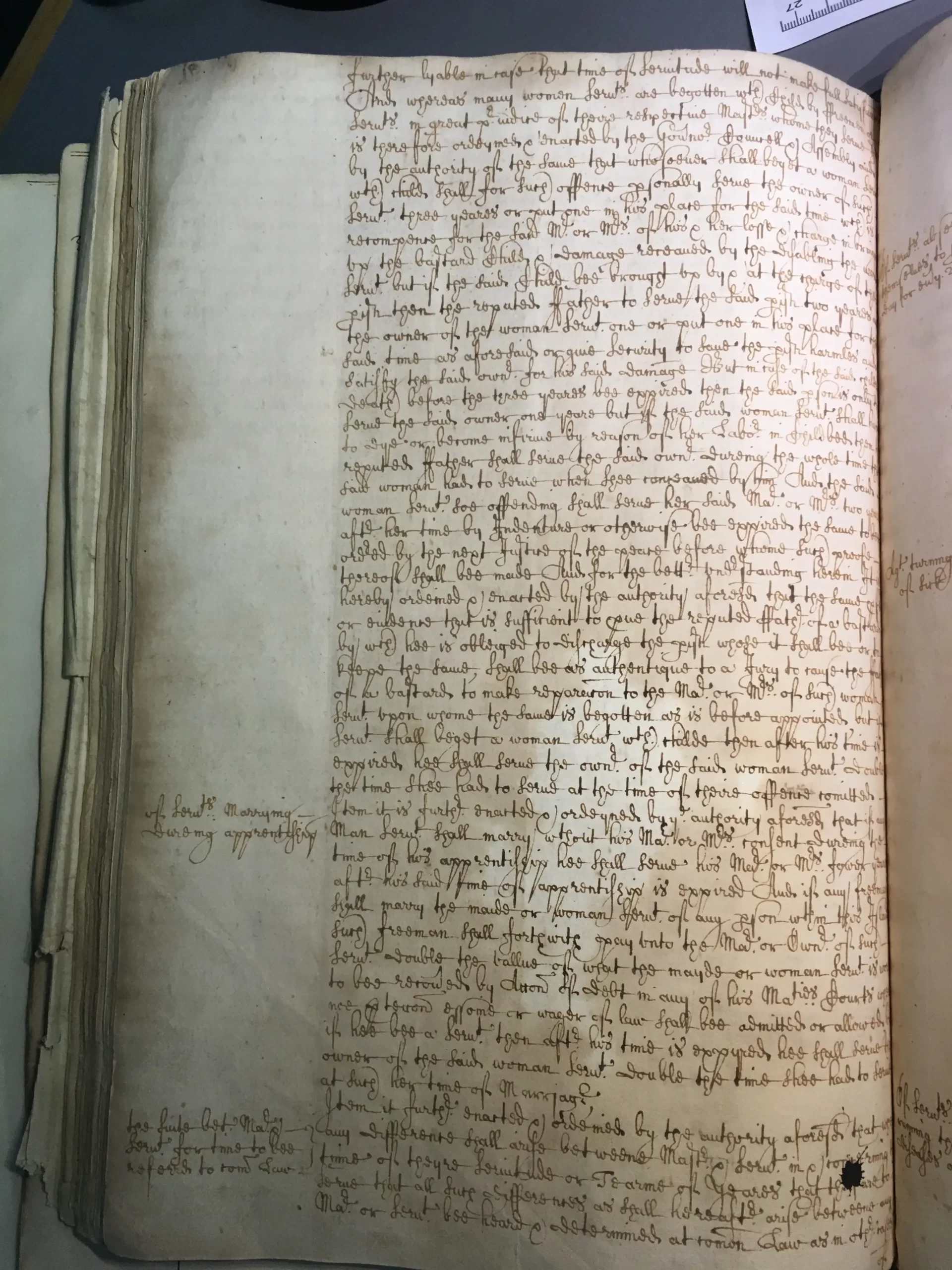 Item(?) it is further enacted & ordeyned by the authority aforesaid that if any Man Servant shall marry without his Master or Mistresses consent dureing the time of his apprenticeship hee shall serve his Master or Mistress fower [four] yeares after his said time of apprenticeship is expired And if any freemen shall marry the maide or woman Servant of any person within this Island such freeman shall forthwith pay unto the Master or Owner of such Servant double the vallue of what the mayde or woman Servant is worth to bee recorded by Action of debt in any of his Majestys Courts which noe protection essoine or wager of law shall bee admitted or allowed. If hee bee a Servant then after his time is expired hee shall serve the owner of the said woman Servant double the time shee had to serve at such her time of Marriage.