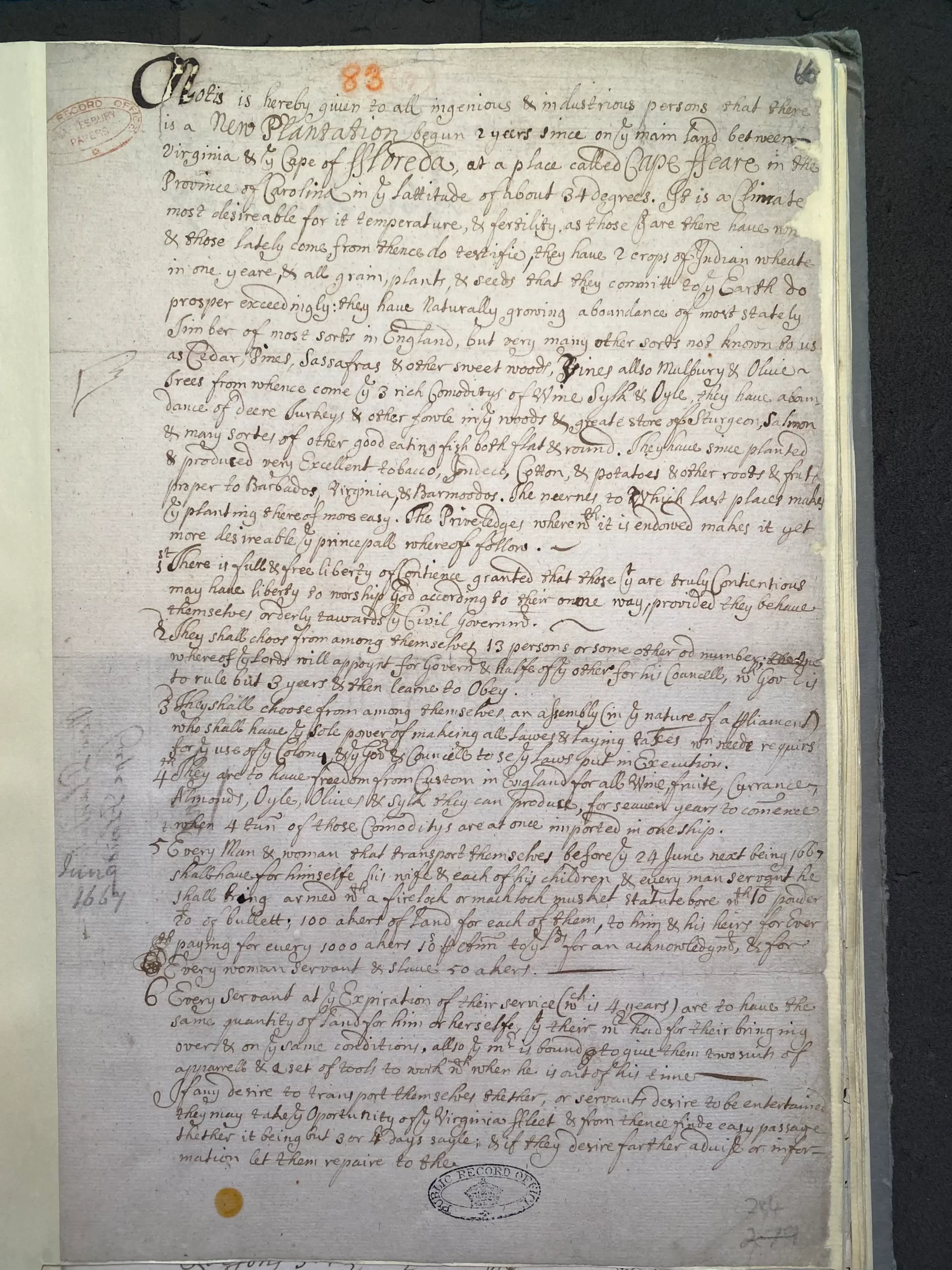 Charles II had granted the Lords Proprietors, including John Locke’s patron, Anthony Ashley Cooper, an expansive charter for their colony in 1663. Locke became the secretary of the proprietorship in 1668, as the proprietors began to formally organize their colony. As secretary, Locke penned the Fundamental Constitutions of Carolina in 1669 at the behest of the Lords Proprietors, which formally set the structures of governance and law within the Carolina colony. In the years leading up to the Fundamental Constitutions, the Lords Proprietors experimented with organizing the colony to attract settlers. The notice below gives a sense of how the Lords Proprietors sought to entice settlement and structure the colony’s governance and society to encourage development.