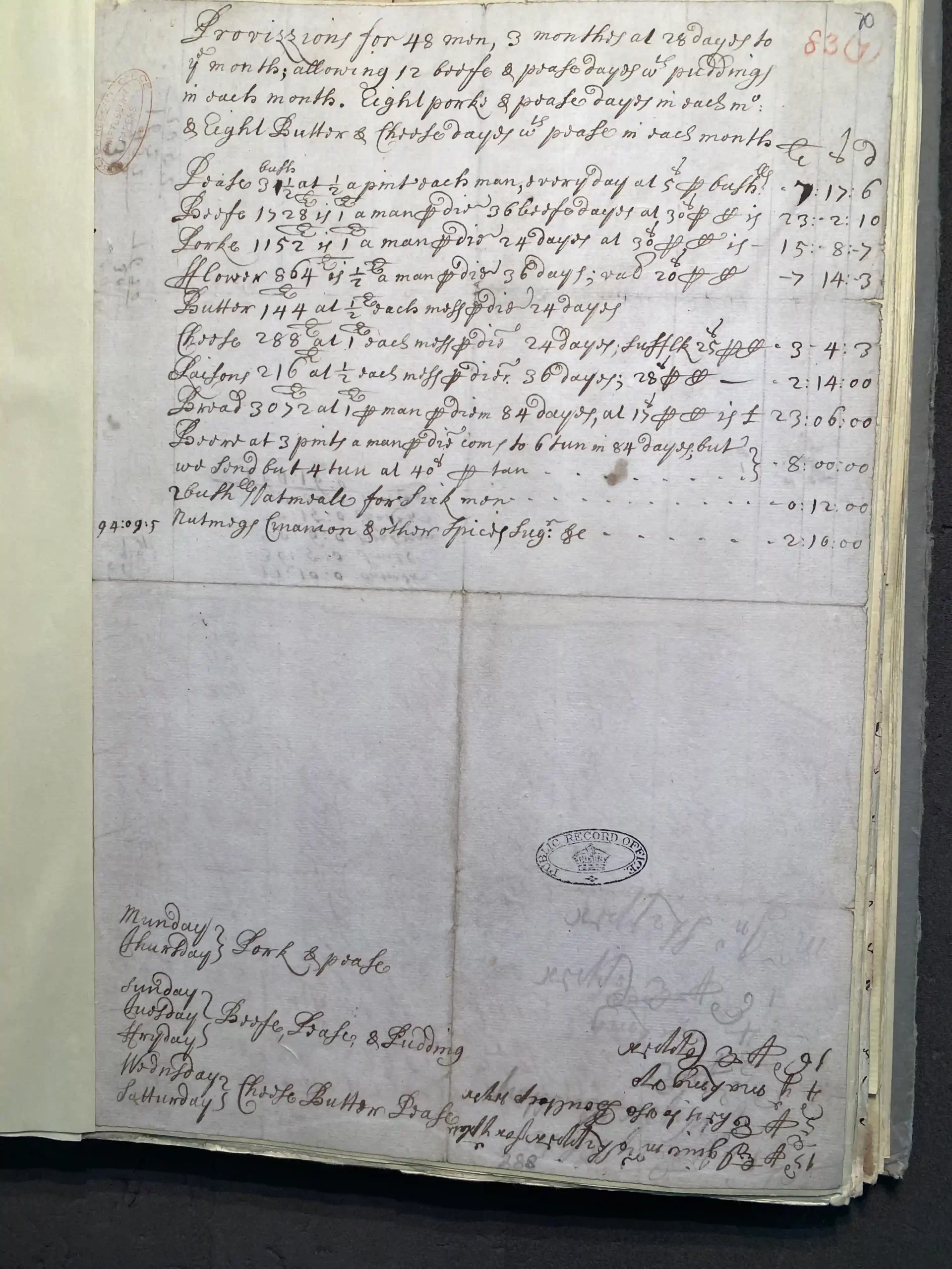 Luding, & Lease, 20 dayes for Porks & pease{?} & 20 dayes